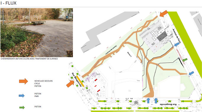 Mise en place de circulations douces et flux avec accès aux véhicules de secours et techniques.