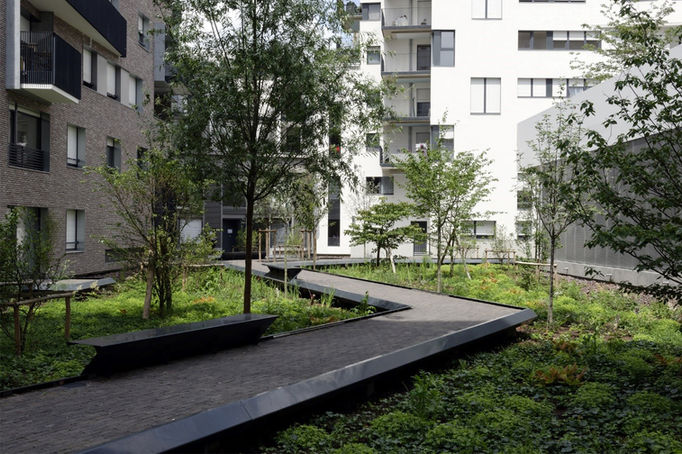 Dans les jardins, une végétation basse se développe en nappe jusqu’au pieds des bâtiments tandis que de grands arbres orientent les vues en accompagnant les percées visuelles de et vers le coeur d’ilot. L’ensemble s’inscrit en décaissé par rapport aux cheminements, assurant naturellement la rétention et l’écoulement des eaux pluviales vers les noues publiques, tout en garantissant l’intimité des RDC. Les cheminements se font sur des passerelles. La densité plantée du coeur d’ilot est prolongé par l’aménagement des toitures basses en véritable jardins suspendus. 2 jardins avec bassins extérieurs de rétention des eaux, passerelles, garage à vélo, mobiliers et réseaux. Plantations extérieurs, passerelles, gestion des eaux.